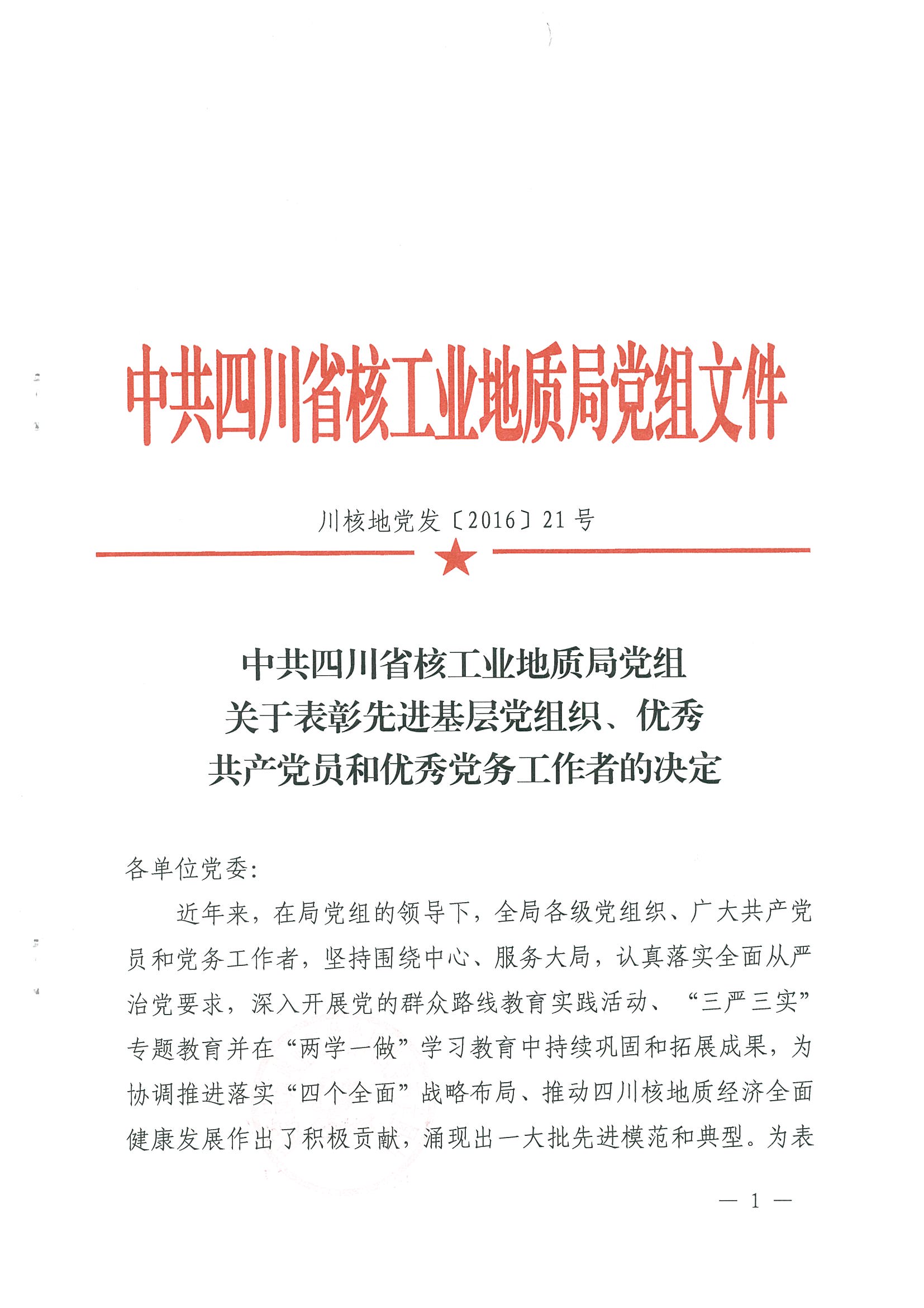 中共四川省核工業(yè)地質(zhì)局黨組關(guān)于表彰先進(jìn)基層黨組織、優(yōu)秀共產(chǎn)黨員和優(yōu)秀黨務(wù)工作者的決定