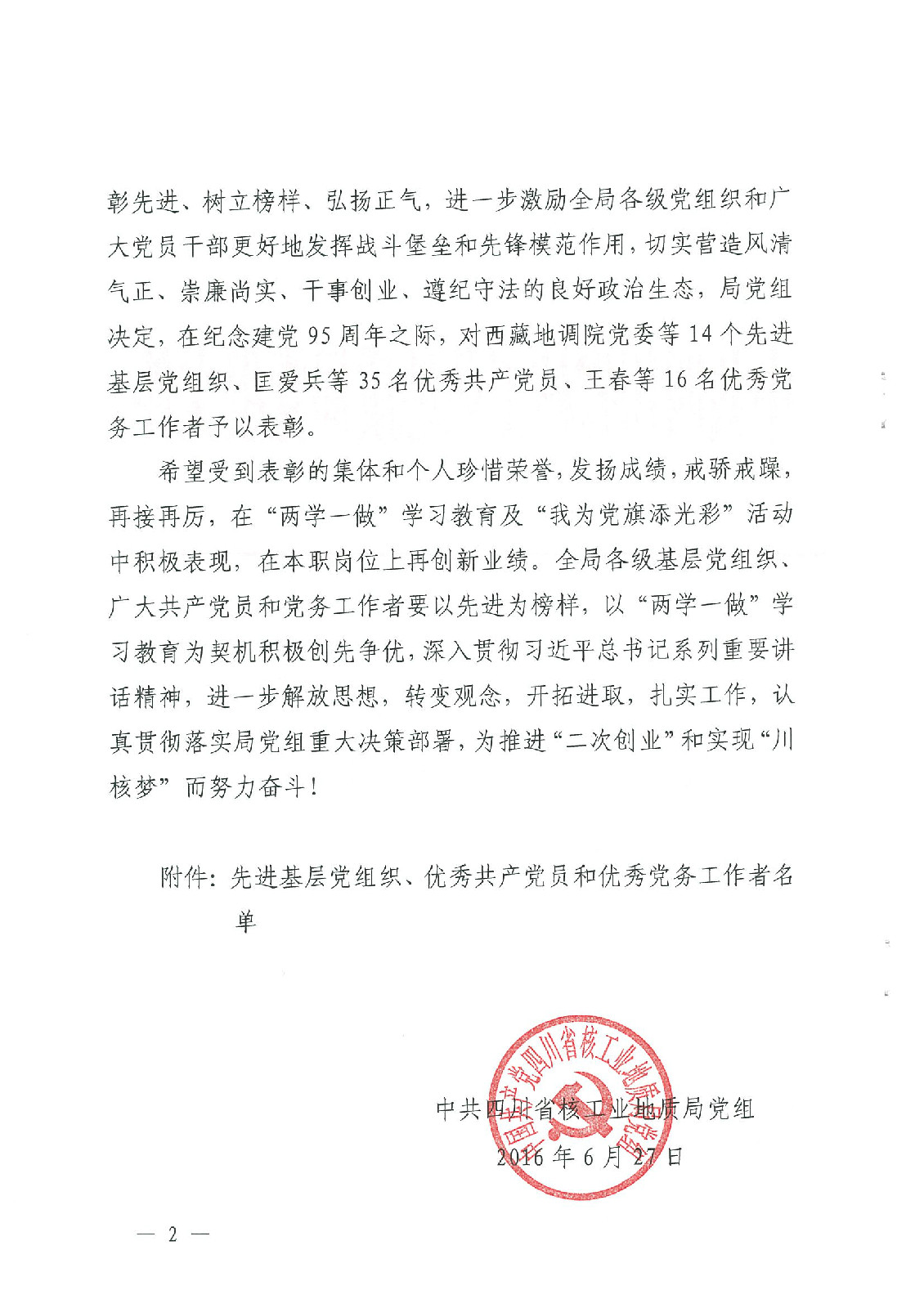 中共核工業(yè)西南勘察設(shè)計(jì)研究院委員會(huì)關(guān)于表彰2016年度優(yōu)秀共產(chǎn)黨員的決定